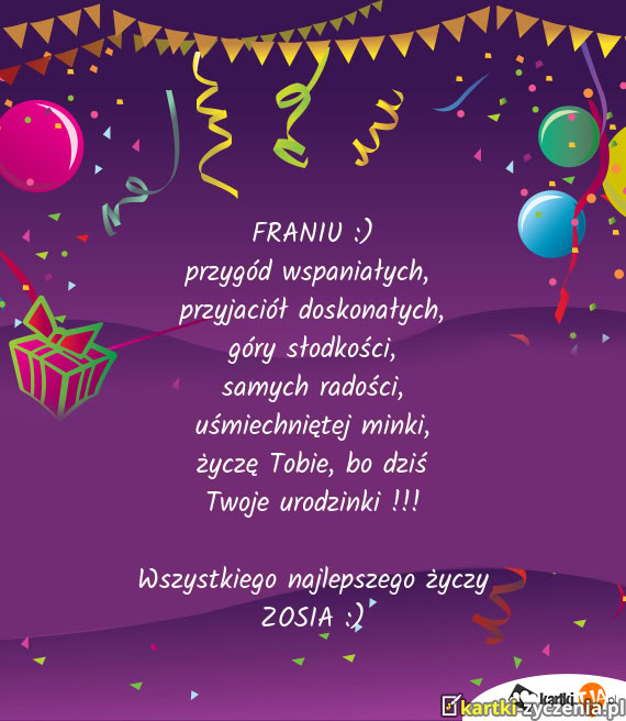kartki na urodziny dla tego samego człowieka, nieprędko się powtórzy. Radosne szablony z tortem, prezentami czy balonami nastroją solenizanta pozytywnie na jego wielki dzień – będą wspaniałą pamiątką, której otwarcie wywoła na jego twarzy szeroki uśmiech. Portal jest bazą gotowych życzeń, które można przesłać przez SMS, za pomocą portalu społecznościowego Facebook, bądź też skopiować do jednego z szablonów, przy okazji sprawdzając, jak dane słowa wyglądałyby z resztą dekoracji. Wybieramy tylko to, co nam się podoba!