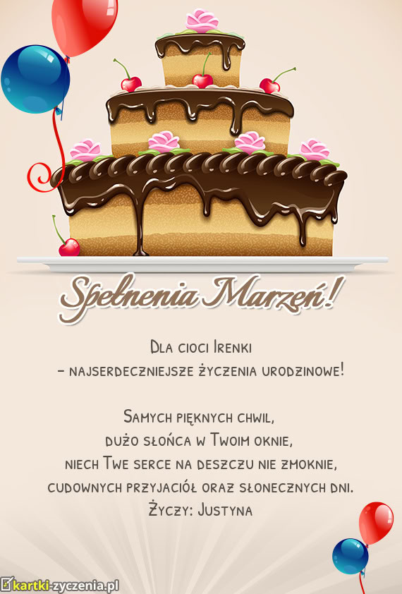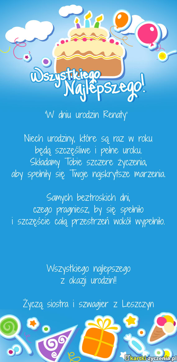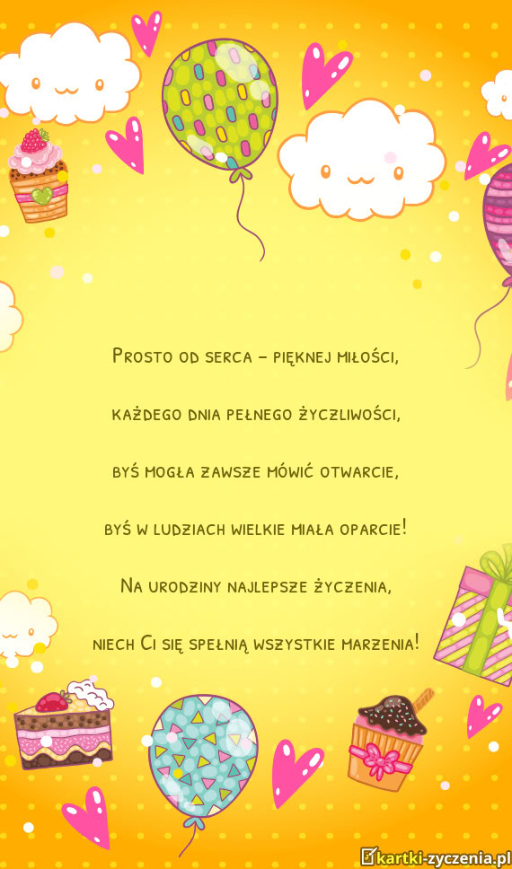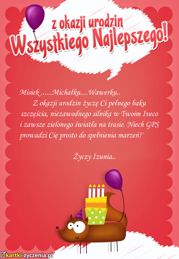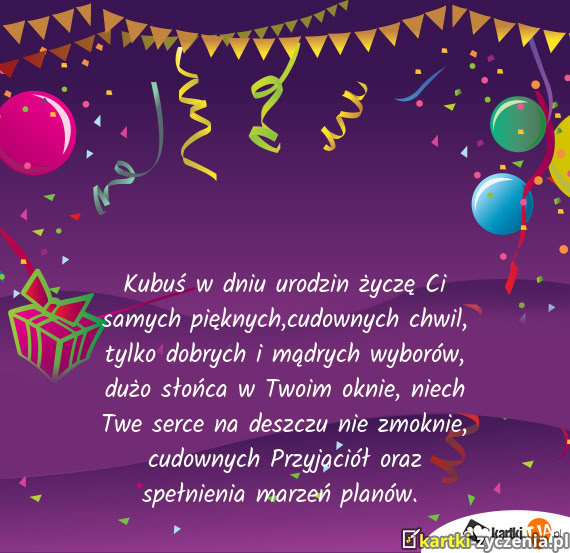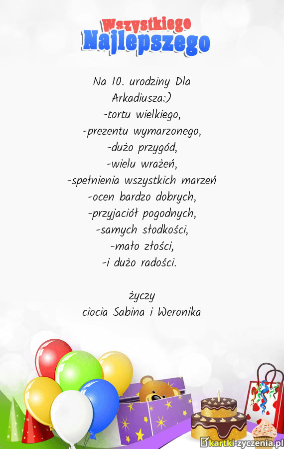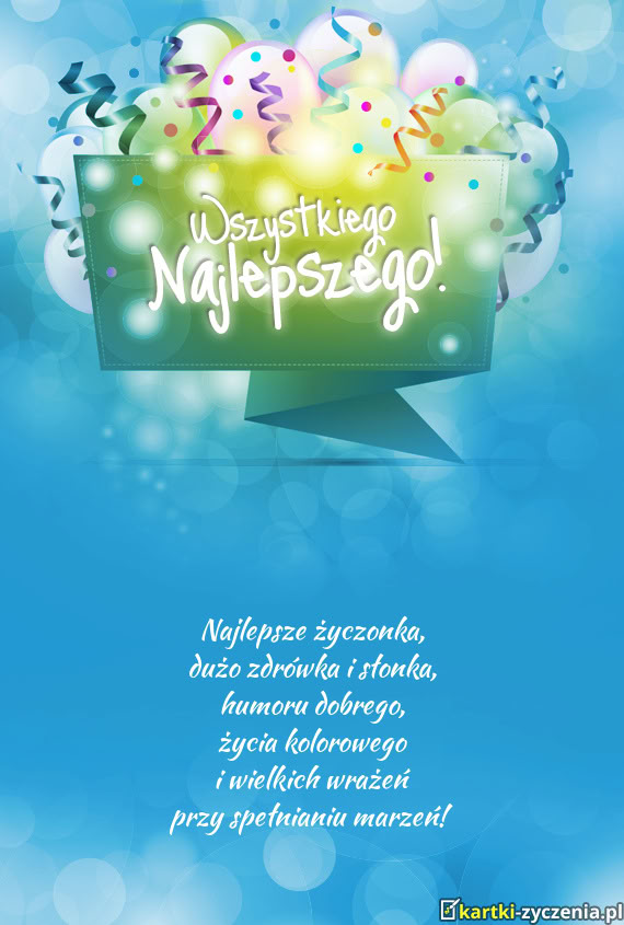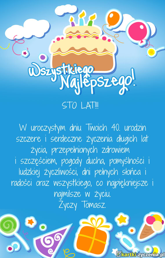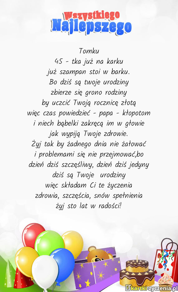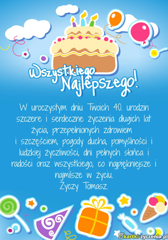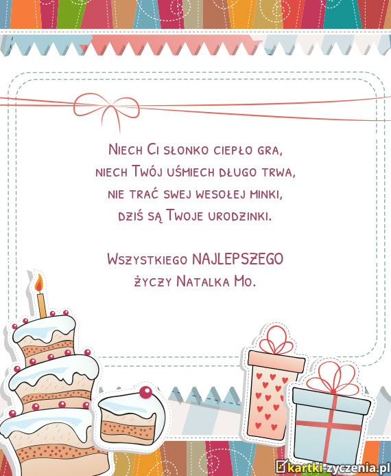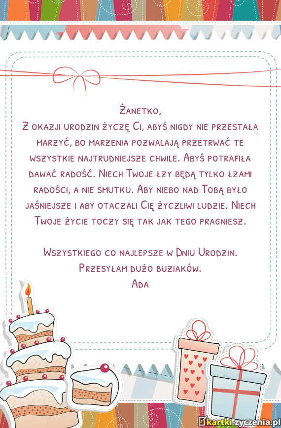 kartki na urodziny dla tego samego człowieka, nieprędko się powtórzy. Radosne szablony z tortem, prezentami czy balonami nastroją solenizanta pozytywnie na jego wielki dzień – będą wspaniałą pamiątką, której otwarcie wywoła na jego twarzy szeroki uśmiech. Portal jest bazą gotowych życzeń, które można przesłać przez SMS, za pomocą portalu społecznościowego Facebook, bądź też skopiować do jednego z szablonów, przy okazji sprawdzając, jak dane słowa wyglądałyby z resztą dekoracji. Wybieramy tylko to, co nam się podoba!