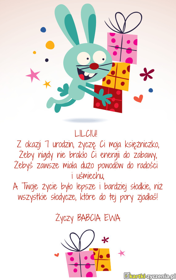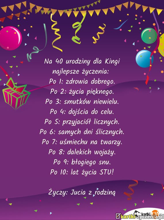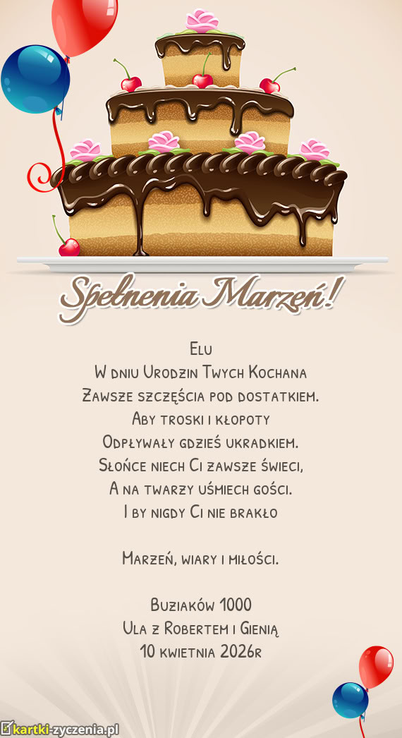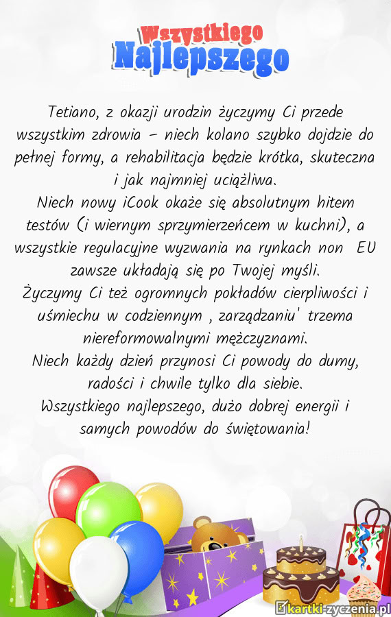 gotowe kartki urodzinowe, tworząc podobne, albo wysyłając je bez zmian do danego solenizanta. W każdej chwili możliwa jest modyfikacja podkładu, wpisanie nowych życzeń, albo wybór losowych. Podgląd uwzględniający wszelkie zmiany ułatwia zadanie, bowiem na bieżąco sprawdzamy jak wygląda nasz twór. Jeśli skończyliśmy, po prostu zapisujemy barwną kartkę i przesyłamy ją do tej szczególnej osoby! Na pewno będzie zachwycona!