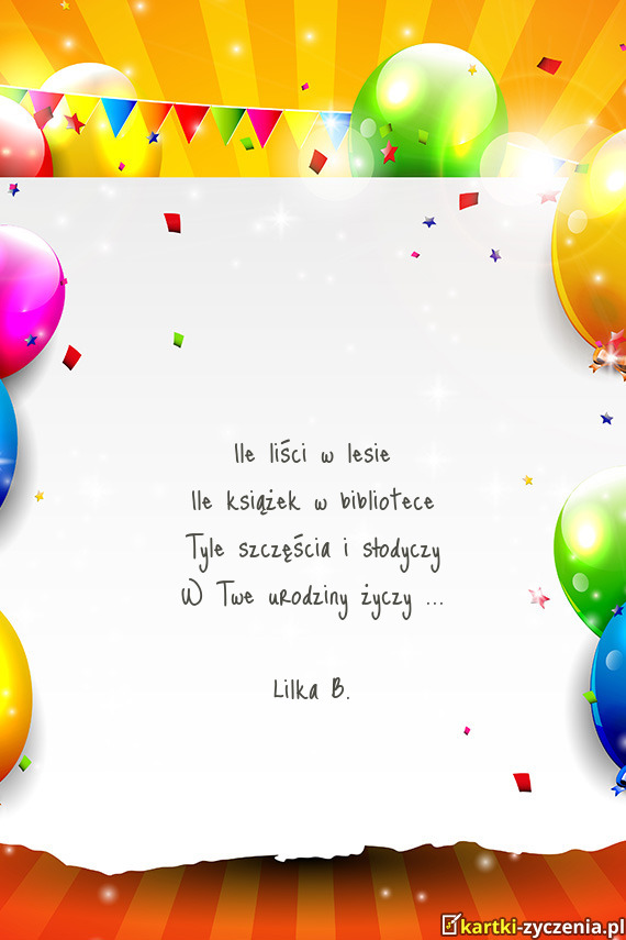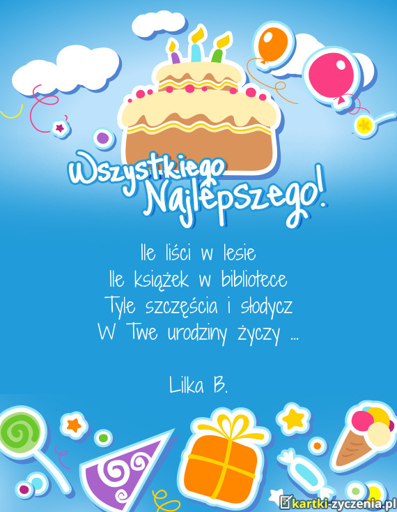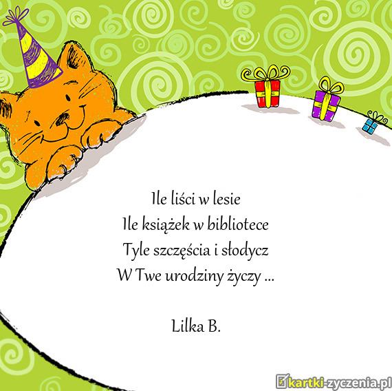 Ile liści w lesie Ile książek w bibliotece Tyle szczęścia i słodyczy W Twe urodziny życzy