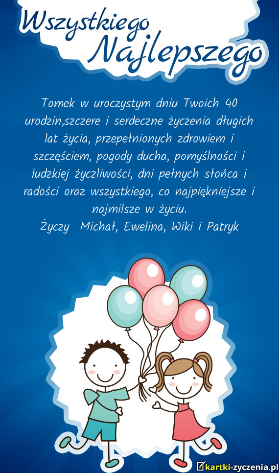 Tomek w uroczystym dniu Twoich 40 urodzin,szczere i serdeczne życzenia długich lat życia, przepełnionych zdrowiem i szczęściem, pogody ducha, pomyślności i ludzkiej życzliwości, dni pełnych słońca i radości oraz wszystkiego, co najpiękniejsze i najmilsze w życiu.