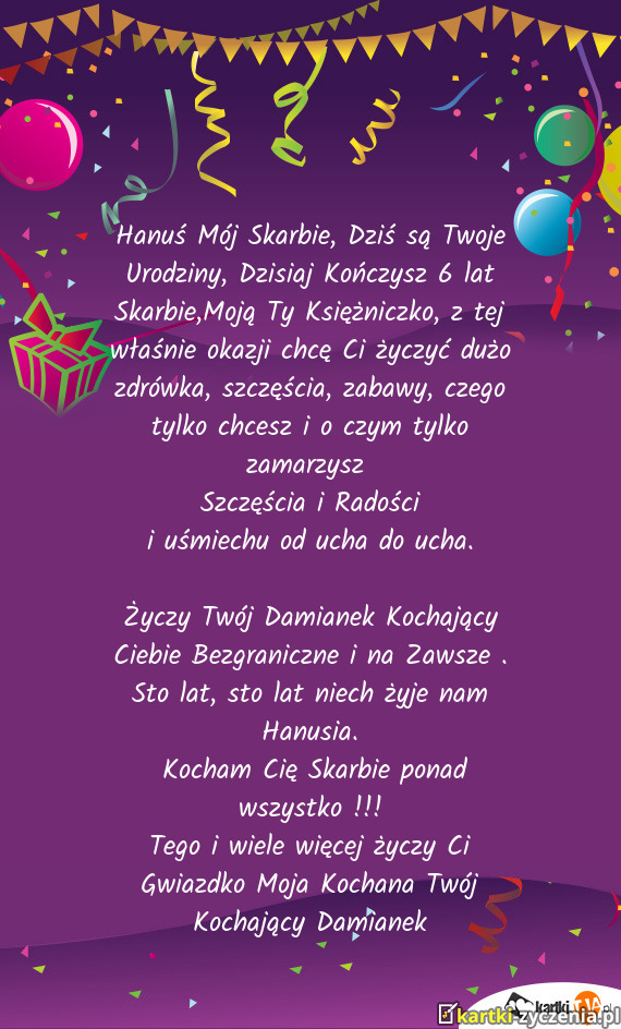 Hanuś Mój Skarbie, Dziś są Twoje Urodziny, Dzisiaj Kończysz 6 lat Skarbie,Moją Ty Księżniczk