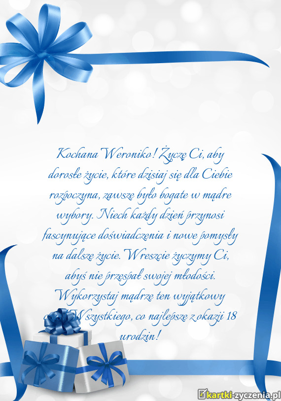 Życzę Ci, aby dorosłe życie, które dzisiaj się dla Ciebie rozpoczyna, zawsze było bogate w mądre wybory. Niech każdy dzień przynosi fascynujące doświadczenia i nowe pomysły na dalsze życie. Wreszcie życzymy Ci, abyś nie przespał swojej młodości. Wykorzystaj mądrze ten wyjątkowy czas! Wszystkiego, co najlepsze z okazji 18 urodzin!