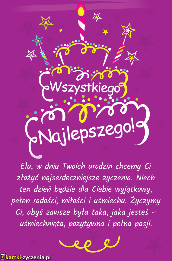 Elu, w dniu Twoich urodzin chcemy Ci złożyć najserdeczniejsze życzenia. Niech ten dzień będzie dla Ciebie wyjątkowy, pełen radości, miłości i uśmiechu. Życzymy Ci, abyś zawsze była taka, jaka jesteś – uśmiechnięta, pozytywna i pełna pasji.