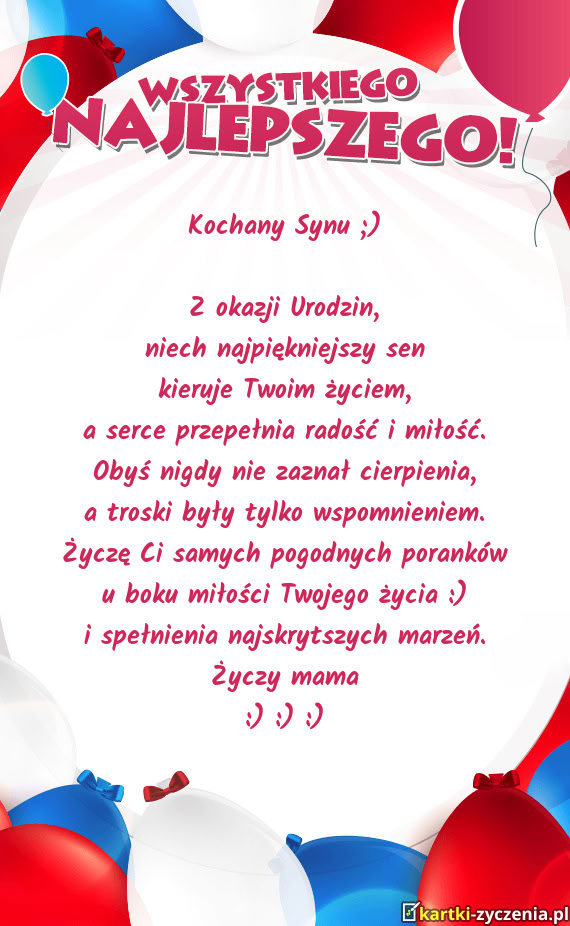 Z okazji urodzin składam Ci moc życzeń: uśmiechu, zdrowia, radości, mnóstwa prezentów i gości, przyjaźni wielkich i małych, wielu przygód niebywałych i uśmiechu wesołego i wszystkiego, wszystkiego najlepszego!