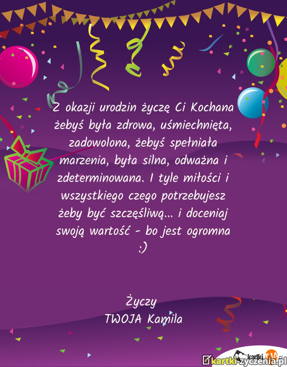 Z okazji urodzin życzę Ci Kochana żebyś była zdrowa, uśmiechnięta, zadowolona, żebyś spełniała marzenia, była silna, odważna i zdeterminowana. I tyle miłości i wszystkiego czego potrzebujesz żeby być szczęśliwą... i doceniaj swoją wartość - bo jest ogromna :)