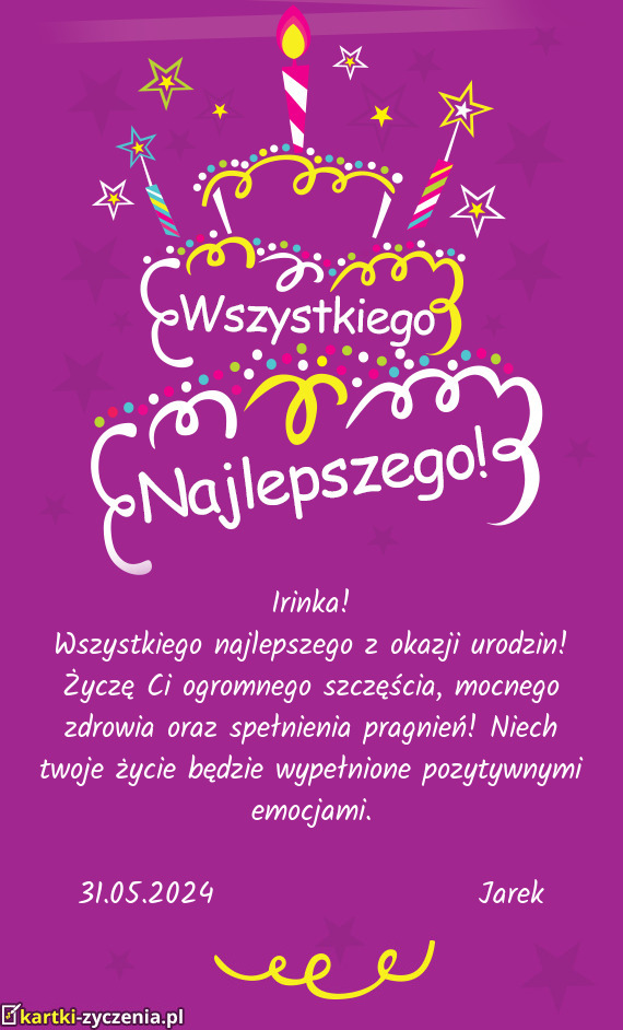 Wszystkiego najlepszego z okazji urodzin! Życzę Ci ogromnego szczęścia, mocnego zdrowia, powodzenia, spełnienia wszystkich pragnień! Niech twoje życie będzie wypełnione pozytywnymi emocjami.