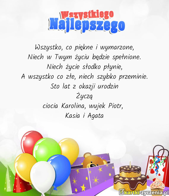 Sto lat z okazji urodzin Życzą ciocia Karolina - Kartka urodzinowa