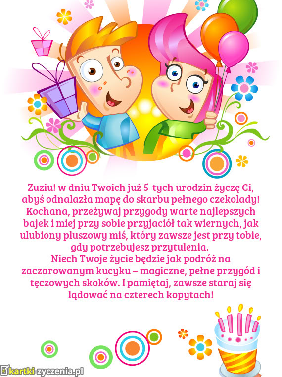 W dniu Twoich już 5-tych urodzin życzę Ci, abyś odnalazła mapę do skarbu pełnego czekolady! Kochana, przeżywaj przygody warte najlepszych bajek i miej przy sobie przyjaciół tak wiernych, jak ulubiony pluszowy miś, który zawsze jest przy tobie, gdy potrzebujesz przytulenia.