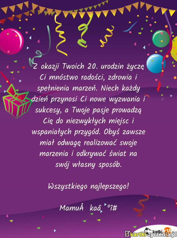 Z okazji Twoich 20. urodzin życzę Ci mnóstwo radości, zdrowia i spełnienia marzeń. Niech każdy dzień przynosi Ci nowe wyzwania i sukcesy, a Twoje pasje prowadzą Cię do niezwykłych miejsc i wspaniałych przygód. Obyś zawsze miał odwagę realizować swoje marzenia i odkrywać świat na swój własny sposób.