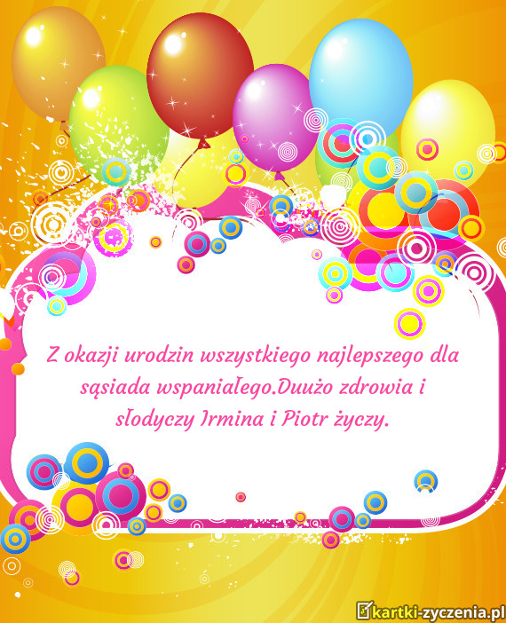 Z okazji urodzin wszystkiego najlepszego dla sąsiada wspaniałego.Duużo zdrowia i słodyczy Irmina - Kartka urodzinowa