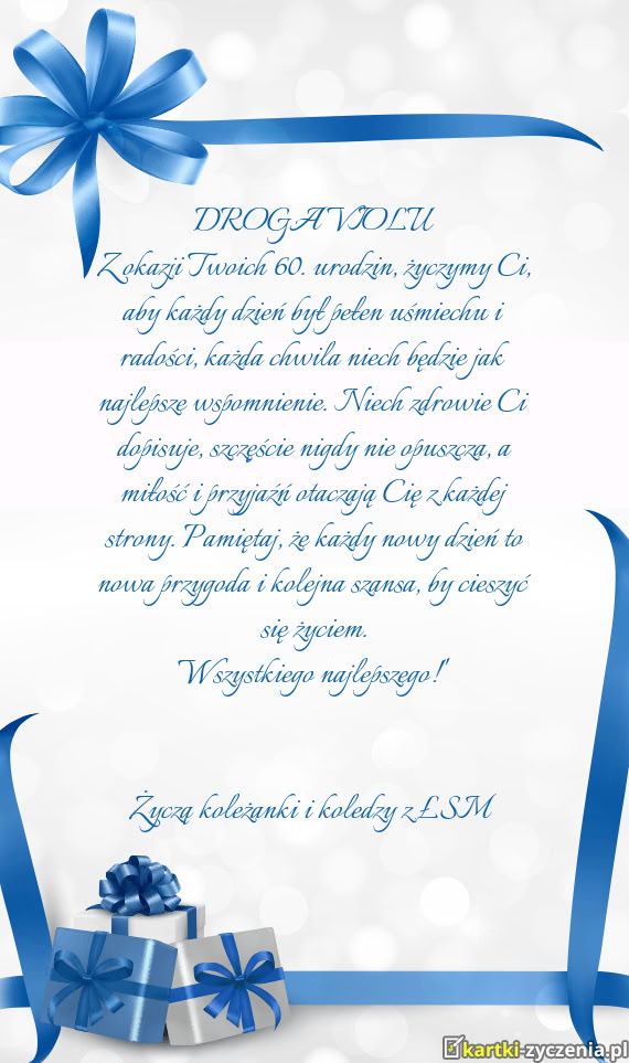 W dniu Twoich 60. urodzin, życzymy Ci, aby każdy dzień był pełen uśmiechu i radości, każda chwila niech będzie jak najlepsze wspomnienie. Niech zdrowie Ci dopisuje, szczęście nigdy nie opuszcza, a miłość i przyjaźń otaczają Cię z każdej strony. Pamiętaj, że każdy nowy dzień to nowa przygoda i kolejna szansa, by cieszyć się życiem. Wszystkiego najlepszego!"