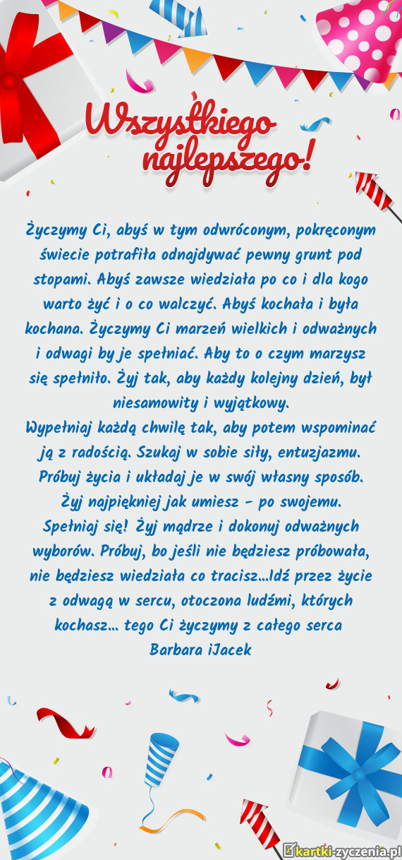 Życzymy Ci, abyś w tym odwróconym, pokręconym świecie potrafiła odnajdywać pewny grunt pod stopami. Abyś zawsze wiedziała po co i dla kogo warto żyć i o co walczyć. Abyś kochała i była kochana. Życzę Ci marzeń wielkich i odważnych i odwagi by je spełniać. Aby to o czym tak marzysz się spełniło, a to co tak kochasz, Twoje było. Żyj tak, aby każdy kolejny dzień, był niesamowity i wyjątkowy.
