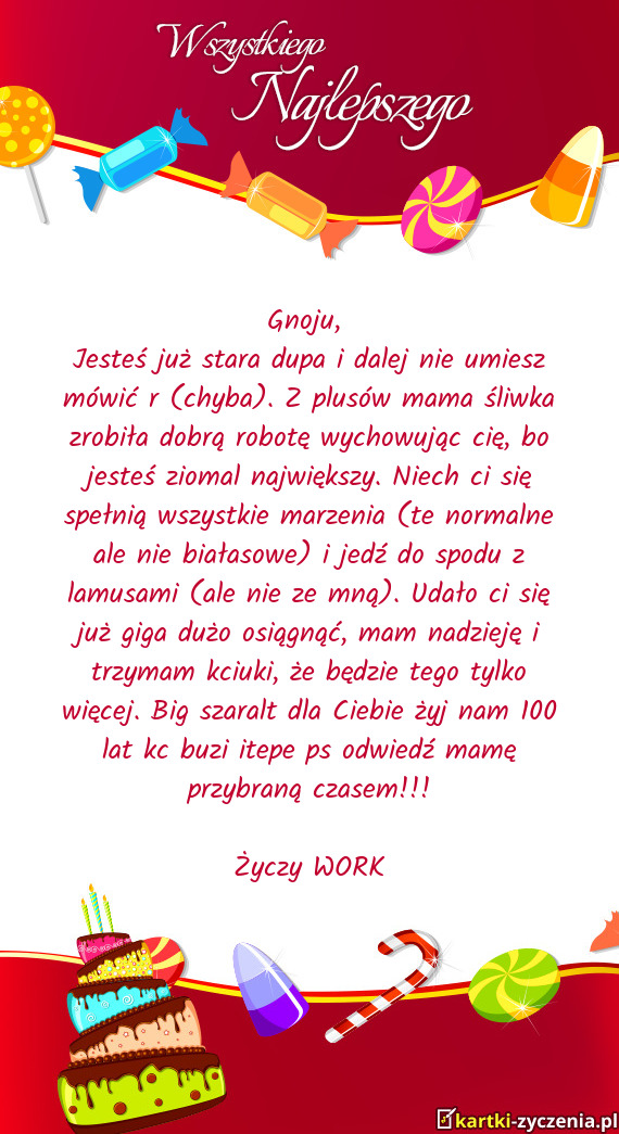 Jesteś już stara dupa i dalej nie umiesz mówić r (chyba). Z plusów mama śliwka zrobiła dobrą