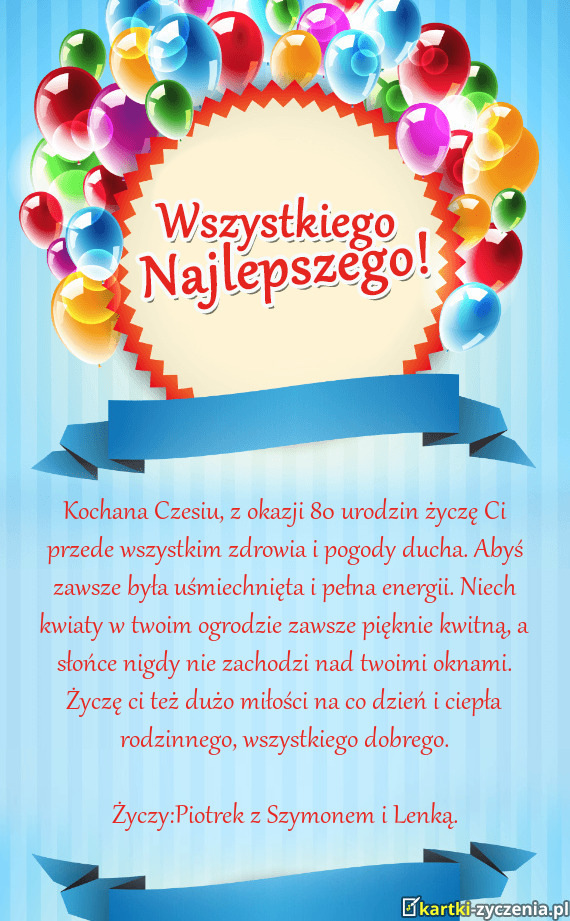 Kochana Czesiu, z okazji 80 urodzin życzę Ci przede wszystkim zdrowia i pogody ducha. Abyś zawsze